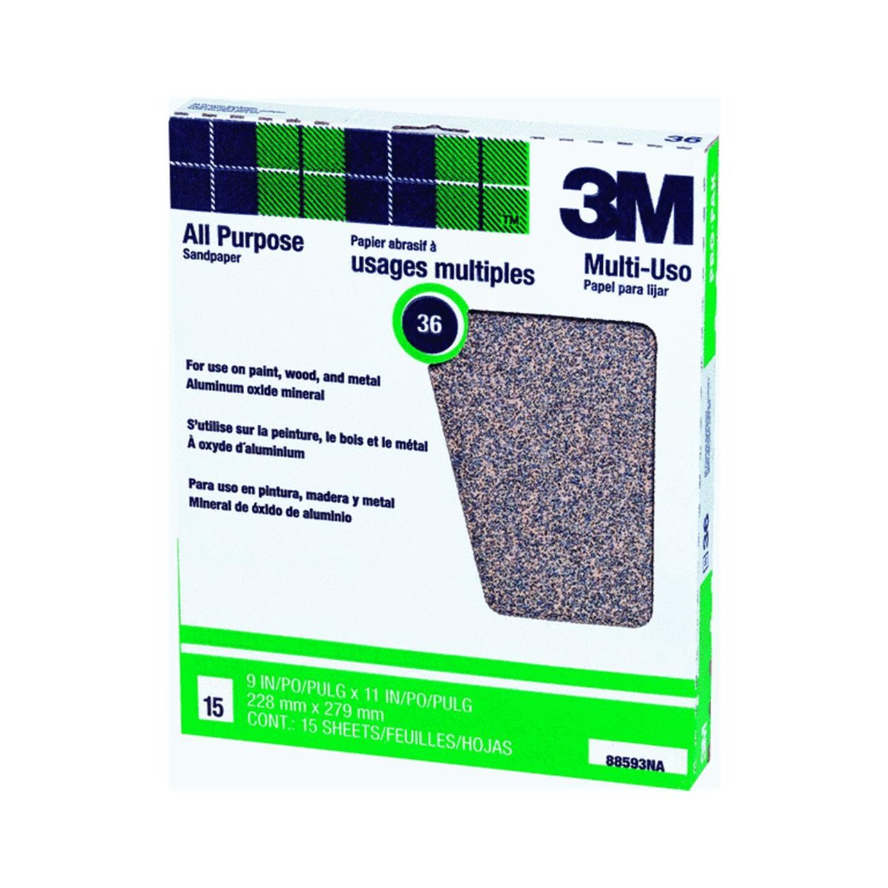 3M™ Pro-Pak™ Aluminum Oxide Sandpaper for paint and rust removal. Tough, durable aluminum oxide coating. Flexible "D" weight backing for dry sanding of painted wood & metal. Ideal for sanding wood, paint, metal, plastic, drywall and fiberglass. Long-lasting. Sanding sheets are packaged 15 per box. Packages are tri-lingual & die cut for convenience.