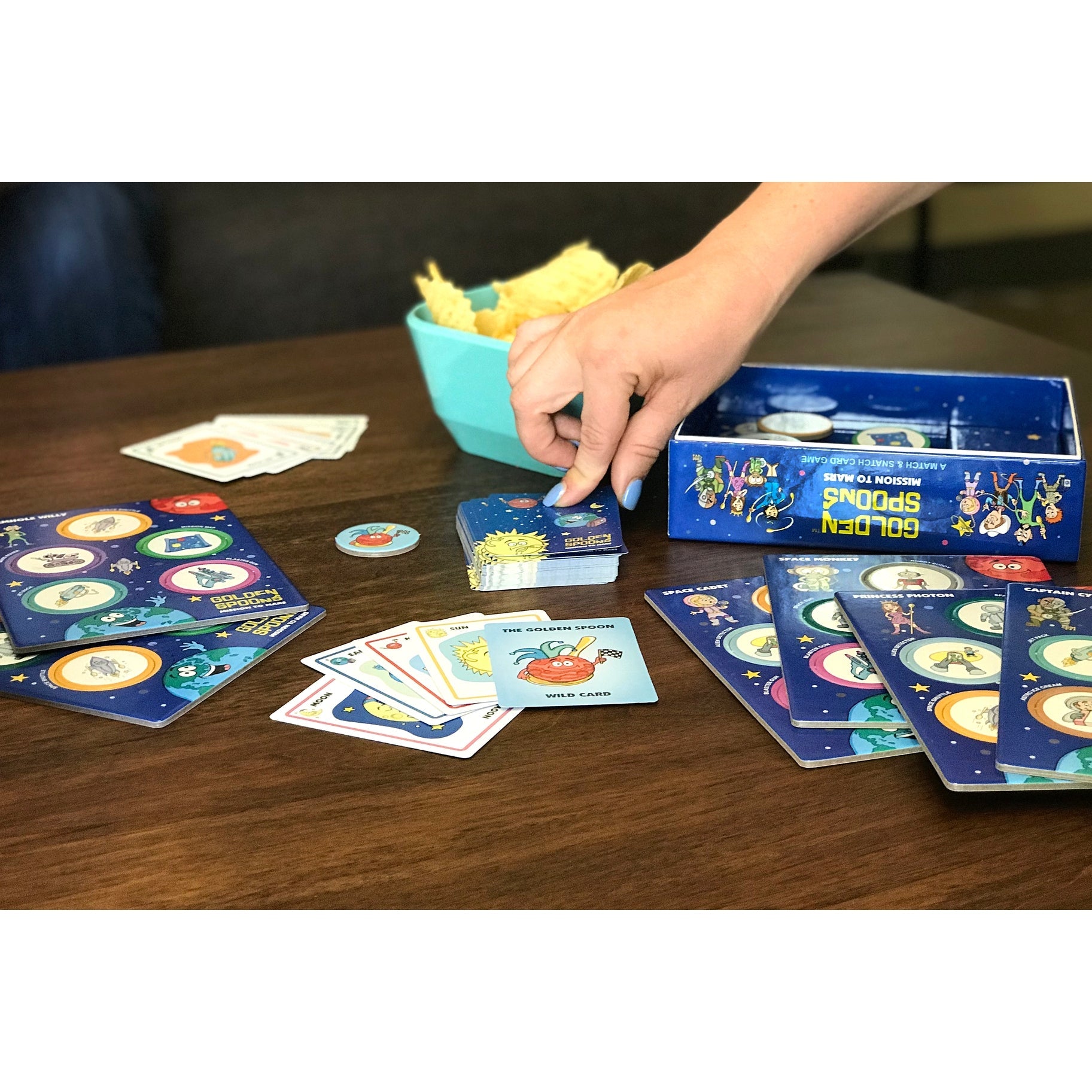 An out-of-this-world take on the classic Spoons card game Family-friendly designs and characters Attractive retail packaging High-quality, action packed fun 54 Playing Cards 8 Mission Cards 40 Mission Tokens Golden Spoon Token Instructions Ages 7+ 2-8 players 10-25 minutes