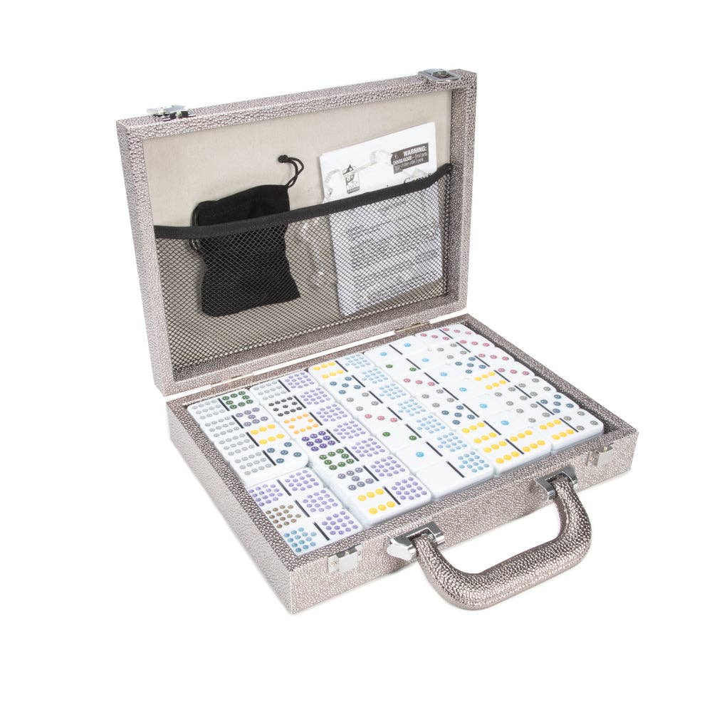Make it a game night with The Mexican Train Dominoes Set. This fun and classic domino matching game comes in a stylish vegan leather case lined in velvet, 136 colored dominoes, 9 trains, acrylic hub, scorecard and instructions. (#3265, 3492-3494) Dimensions: 14.42"L x 9.13"W x 2.60"H