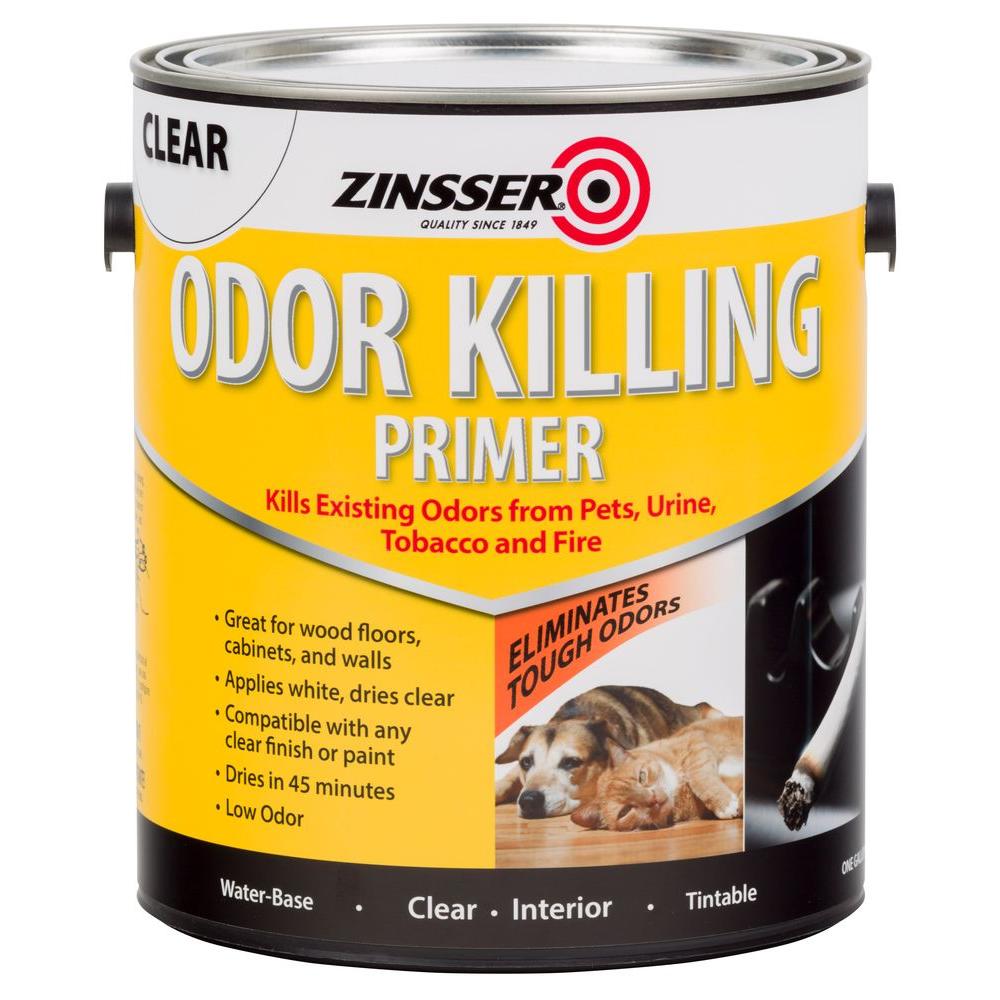 Zinsser Odor Killing Primer is a low odor, water-based primer that kills existing odors on interior surfaces. It applies white and dries fast to a clear, low sheen finish to permanently seal in odors. Odor Killing Primer is designed to eliminate difficult existing odors from pets (including urine), food, cigarette and cigar smoke, fire and smoke damage. Odor Killing Primer is compatible with all clear finishes and paints, both water and oil based. To hide unwanted stains while blocking odors, use Zinsser BIN Ultimate Stain Blocker. Odor Killing Primer is suitable for use on all painted or unpainted interior surfaces such as wood floors, cabinets, walls and ceilings, including drywall, cured plaster, masonry, metal and PVC. Odor Killing Primer has excellent adhesion to glossy surfaces such as enamel paints and varnishes, paneling, laminates, galvanized metal, glass and ceramic tile, without the need for sanding or deglossing.